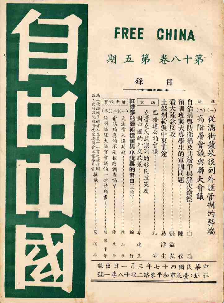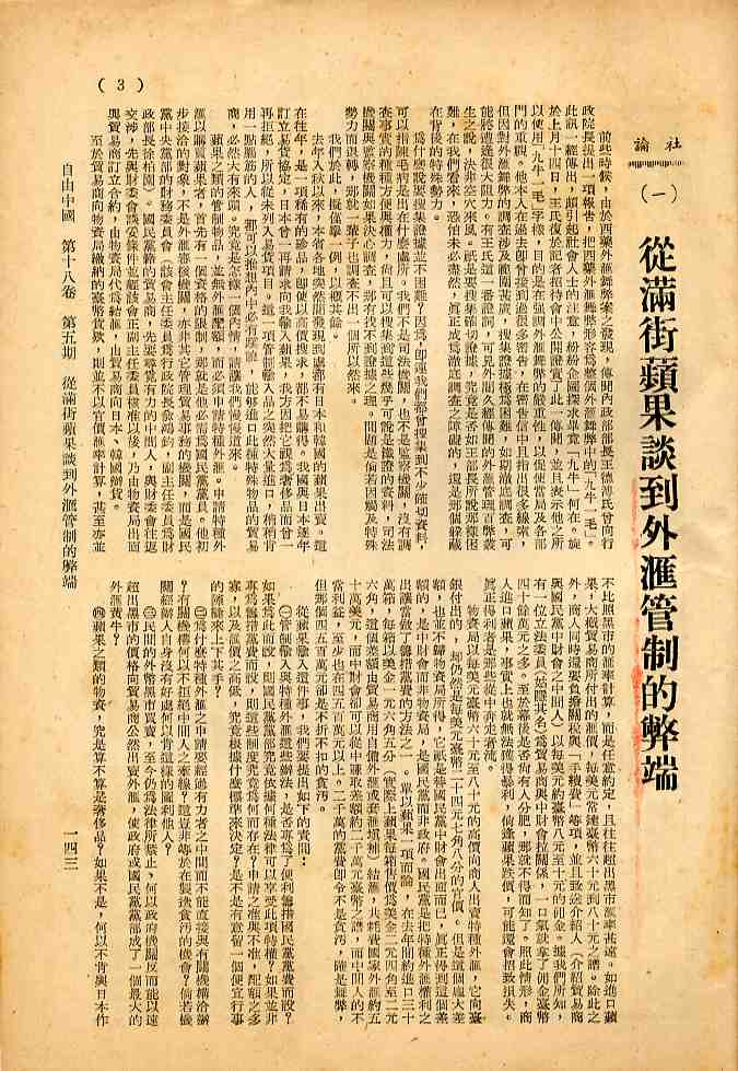 《自由中國》18卷5期〈社論〉1:〈從滿街蘋果談到外匯管制的敝端〉